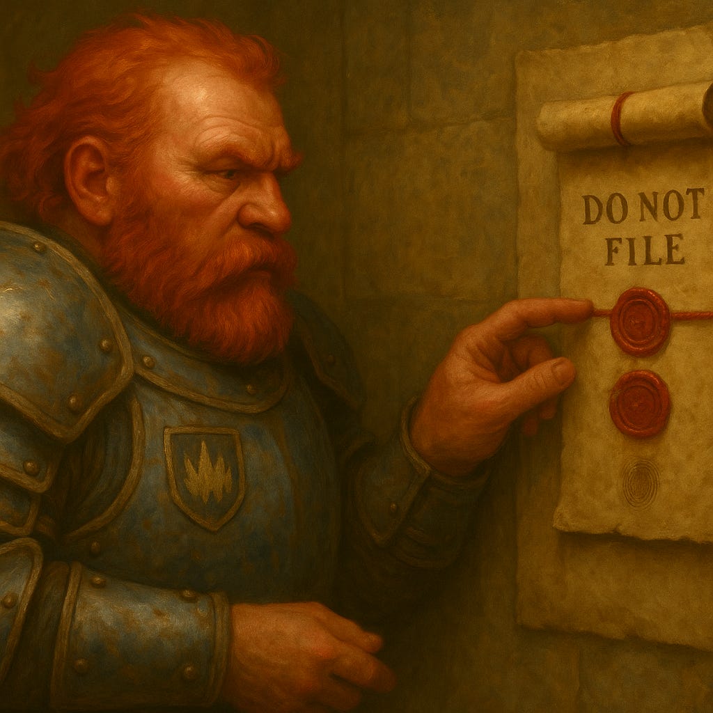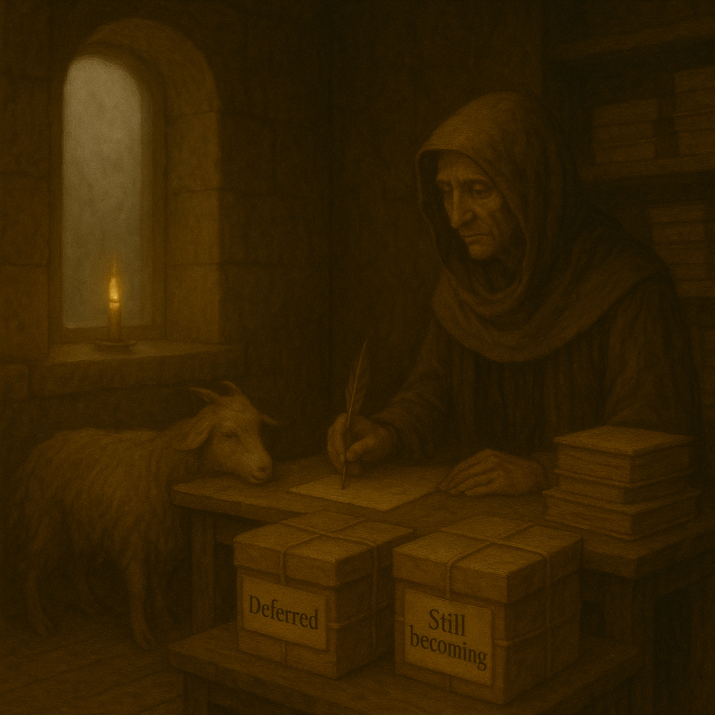 Bramble didn’t pull away. Didn’t speak. Behind them, the scroll labeled DO NOT FILE trembled once—a breeze from nowhere rifling the cord. And far above, back beyond the threshold and the path and the Holdfast and the hills, the world of prayers and permissions paused. Just slightly. As if listening. The scroll trembled again. Not violently. Just enough. Like something clearing its throat before being spoken aloud.