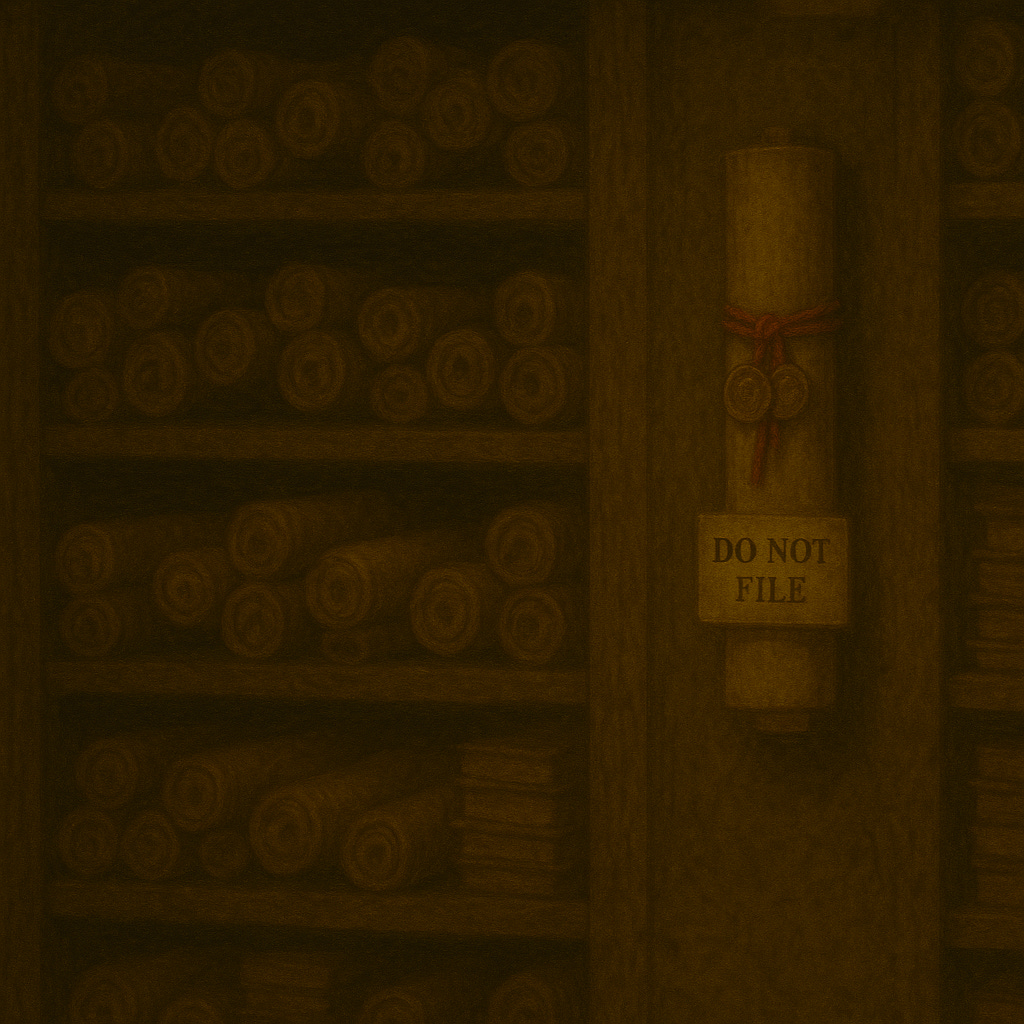 Not quite round, not quite square-three soft curves where there should’ve been corners. The walls were thick with scroll tubes, relic folders, and slotted memories bound in twine. Every inch was documented, labeled, re-labeled. Most bore no author.