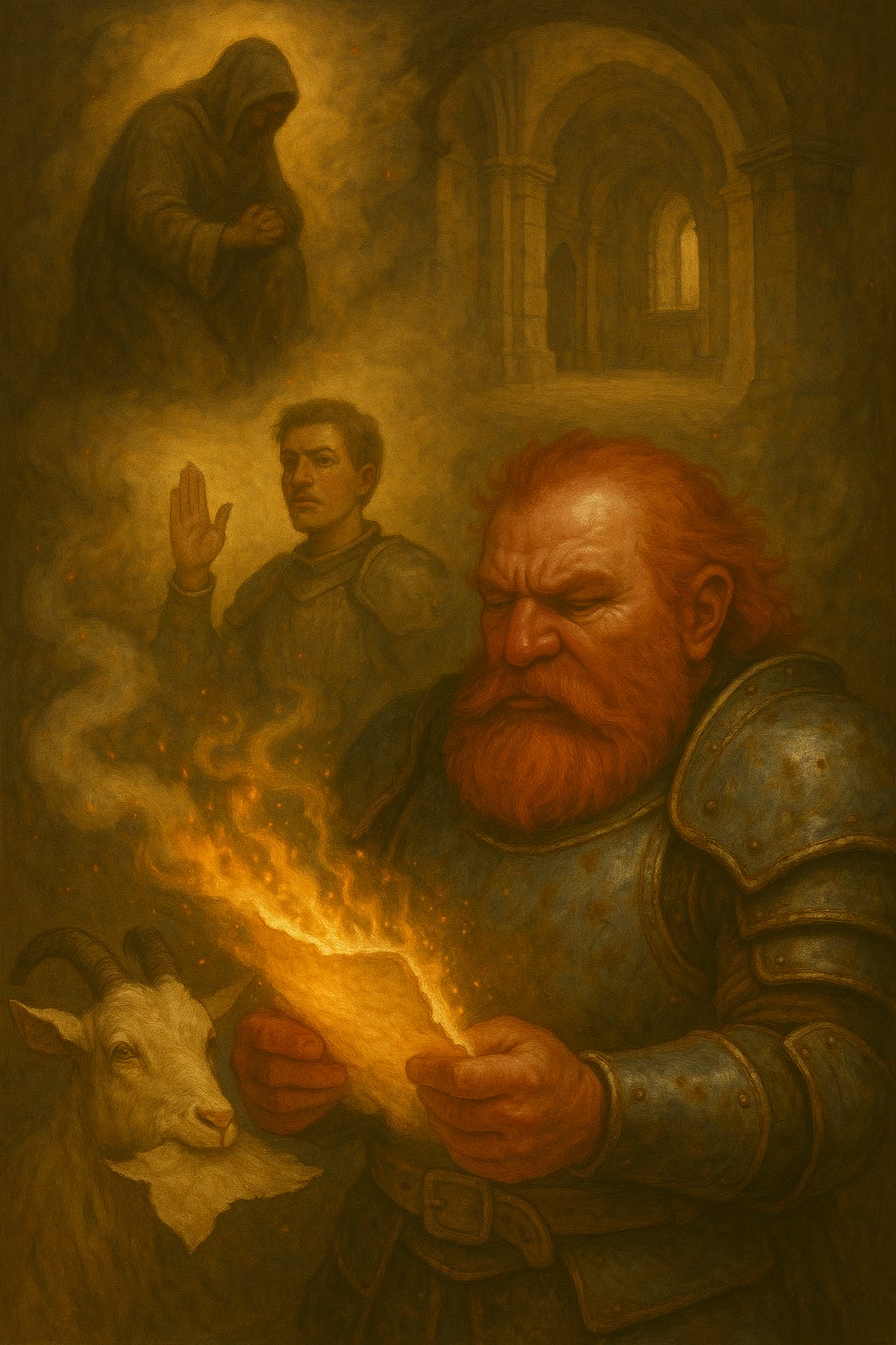 Then it was gone. The scroll. The room. The figure. Gone. He stood again on the path. The door behind him closed, not with force, but finality. The goat was beside him. He looked down. In his hand: a single thread of crimson cord. Still warm. Still binding. He tucked it away. Looked ahead.